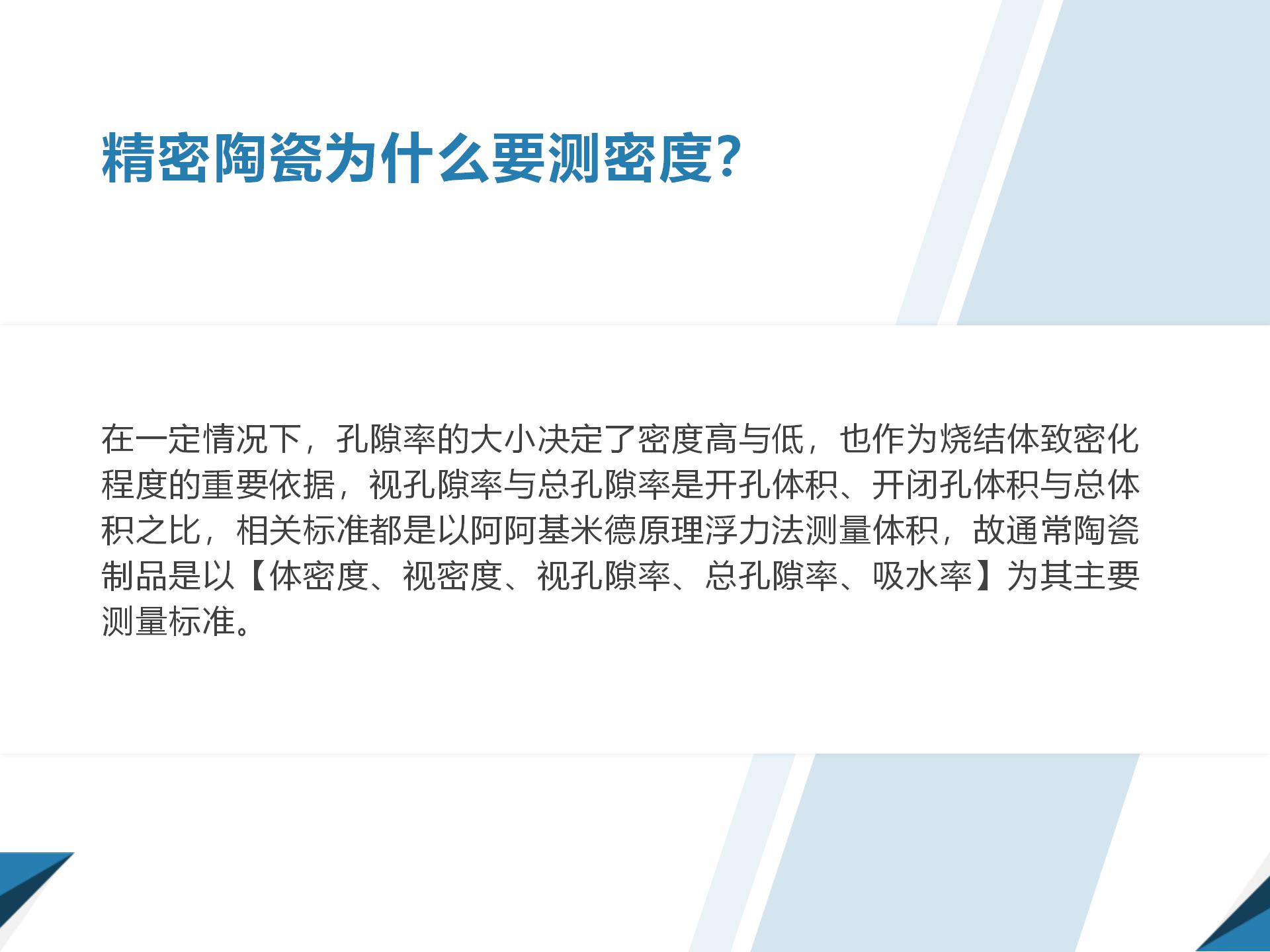 精密陶瓷為什么要測密度?在一定情況下,孔隙率的大小決定了密度高與低,也作為燒結體致密化程度的重要依據,視孔隙率與總孔隙率是開孔體積、開閉孔體積與總體積之比,相關標準都是以阿阿基米德原理浮力法測量體積,故通常陶瓷制品是以【體密度、視密度、視孔隙率、總孔隙率、吸水率】為其主要測量標準。